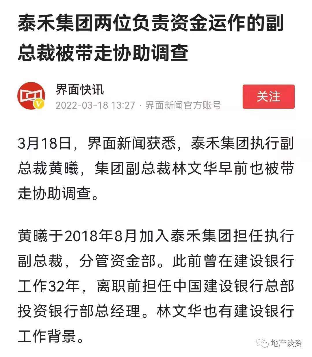 这两位高管分别是泰禾执行副总裁黄曦,以及副总裁林文华先生,这两位高管是泰禾分管资金业务的领导。他们两位被带走调查,还是发生在在泰禾黄老板被带走调查之后,这么大规模的调查,让吃瓜群众想得有点多。
