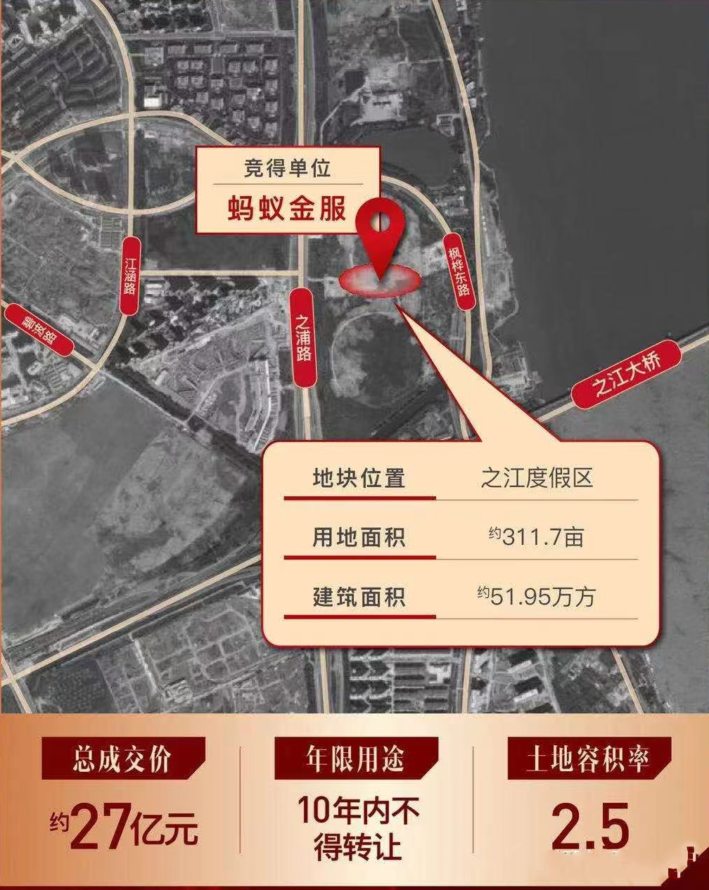 2020年10月22日,蚂蚁集团以底价27亿元竞得飞天园区附近之江度假单元竞得311.7亩地块。