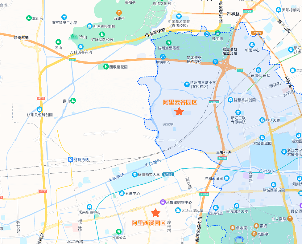 2022年10月,阿里在杭州的另一大型园区阿里云谷建成并投入使用。阿里云谷位于杭州西湖区,占地面积19.8万平方米,总建筑面积45万平方米,目前作为阿里云的全球总部,同时作为菜鸟供应链金融、蘑菇街、二更个推总部以及挖财、51金融等阿里系独角兽企业聚集地。