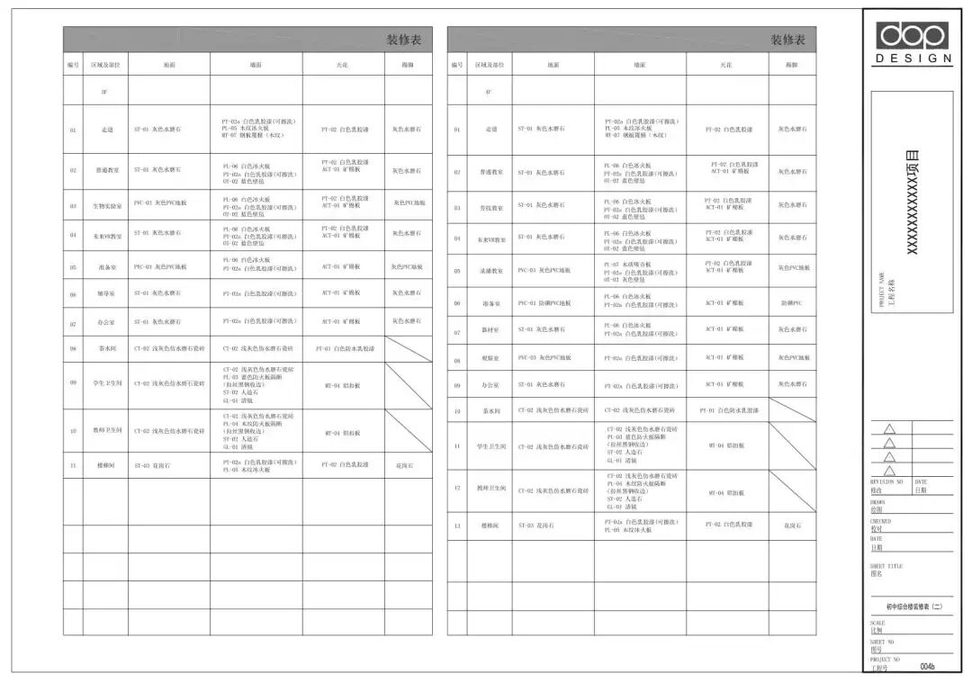 在实际运用当中,装修表非常适合体现设计简单,并且需要大批量重复表达相同设计方案的空间。例如,学校教室和医院病房等空间。