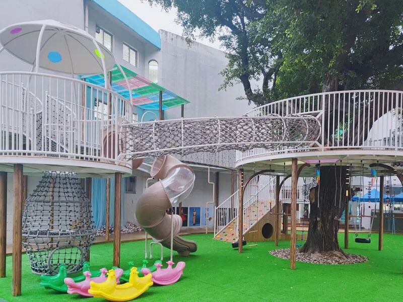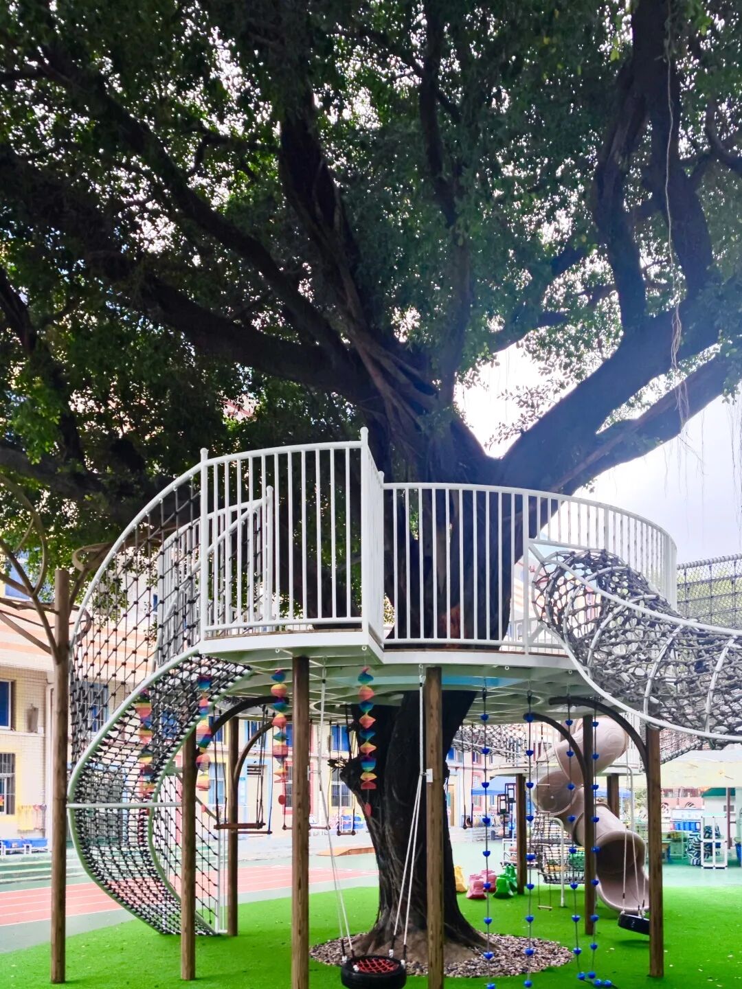 每一天,每一年,幼儿园里的树见证着孩子们的成长,是孩子们熟悉喜爱的玩伴。 在深圳市坪地街道的一所幼儿园庭院中也有这样的大树。2022年,围绕着这棵大榕树和幼儿园教学楼一个无动力的儿童户外玩具诞生了,孩子们又有了更多的乐趣。 这里有可以躲藏穿过的小山洞,可以钻爬的钻笼,可以社交聊天或者进行秘密活动的圆形小屋,还有蜿蜒向上的攀爬过道,锻炼手臂的攀爬墙,晃晃悠悠的平衡吊桥,彩色的玻璃板可以和下方的朋友对望,木质平台与大树枝丫成了玩具的一部分。 户外对孩子们来说是获得生活体验以及成长的重要场所,创造一个让孩子感受自然温度同时能够与自然产生互动的机会,打造一个让孩子亲近自然,感受自然、树木散发出的芬芳,让树木伴随孩子们成长,这或许是这个玩具的意义之一。 当孩子们来到这个区域,从攀爬墙或者是钻笼开始行动,一场孩子们和幼儿园里的树的故事开始了。