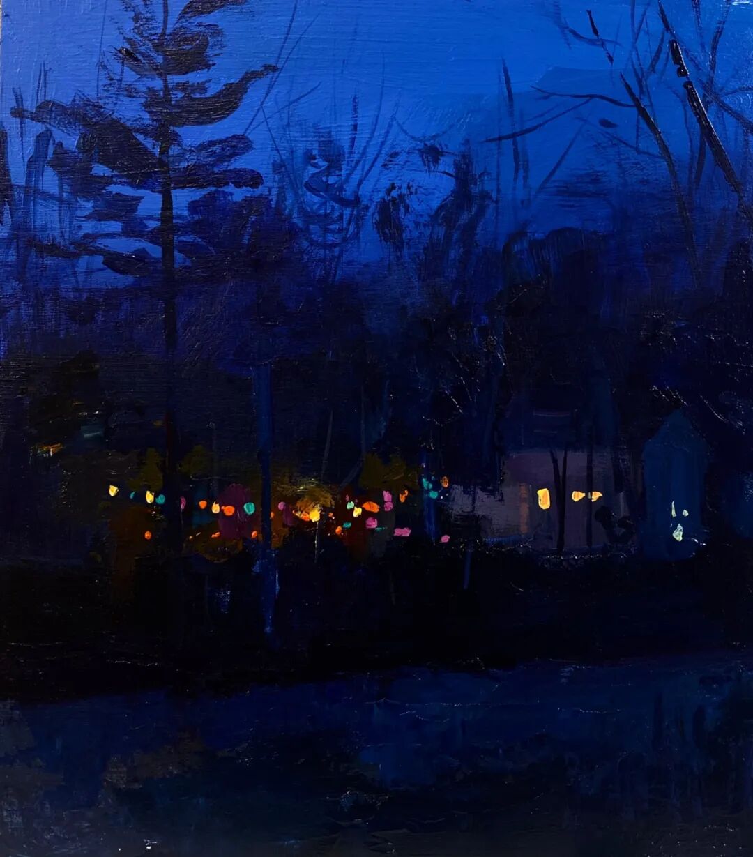 在杰里米-米兰达的画作中,串在树上和衬在水沟里的五颜六色的灯光在沉闷的冬季夜晚投下了欢迎的、充满活力的光辉。