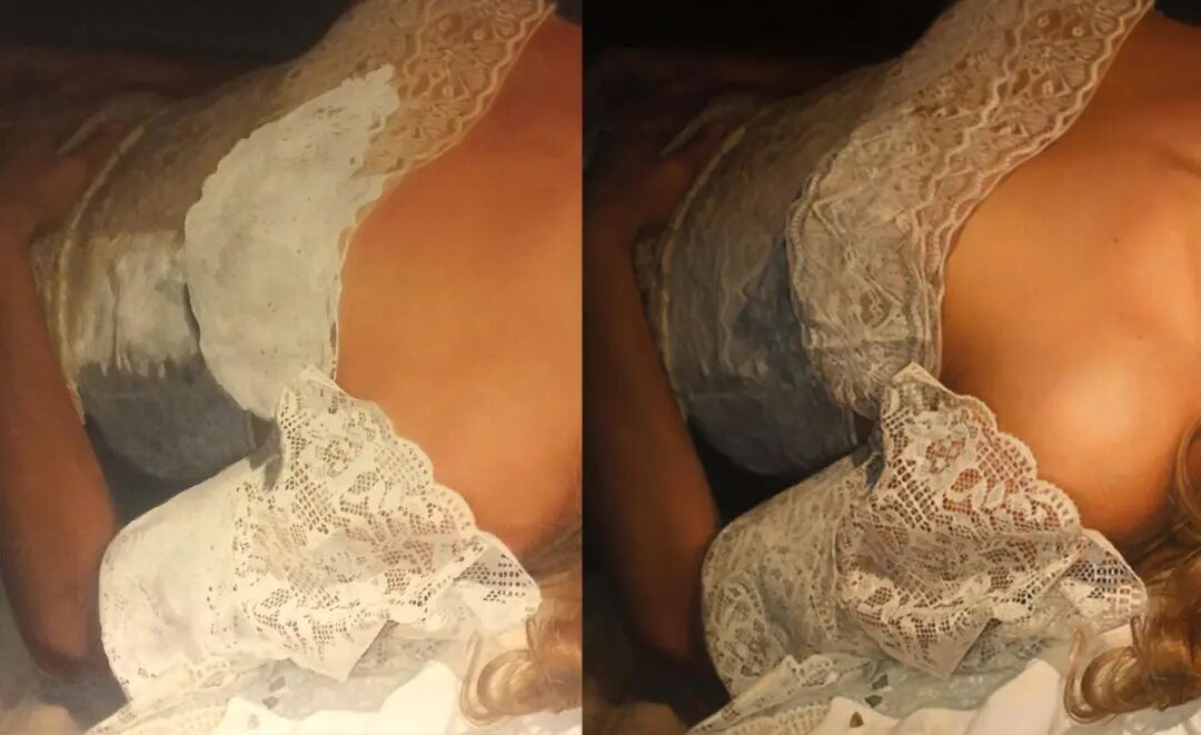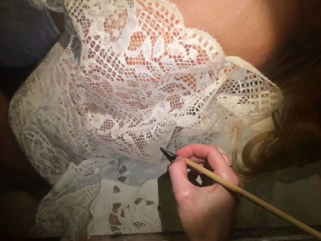 小绛在这里选择了这位超写实画家一幅名叫《花边1》的绘画作品,以及它的绘画过程,让我们一起来见证一下,她是如何将人物服装上的蕾丝花边,都画得栩栩如生吧。