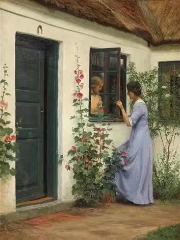 身着浅紫色长裙的女子隔着窗户与室内的女孩聊天。墨绿色的木门与绿色爬山虎相互映衬,房子更像是森林中的一体。紫衣女子的右边悄然绽放着两朵白色蔷薇,一如画中两位女性一般岁月静好。