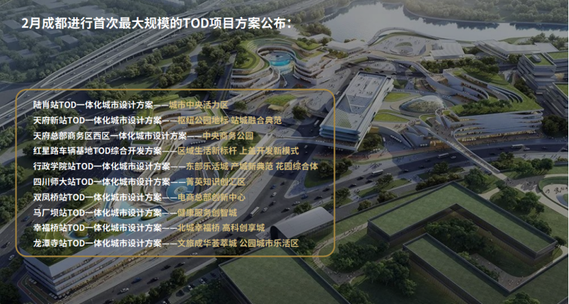 2月5日,成都进行首次最大规模的TOD项目方案集中公布。按照计划,到2023年,成都将全面建成TOD示范项目首期工程,到2025年,完整形成高品质居住中心和多元化消费极核。
