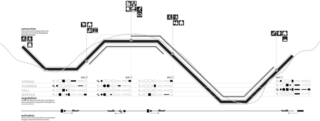 Sava Activities是一个在建的公共城市设计项目,旨在将萨格勒布市的萨瓦河河岸重新引入城市的日常生活。项目激活了7公里长的河岸区域。