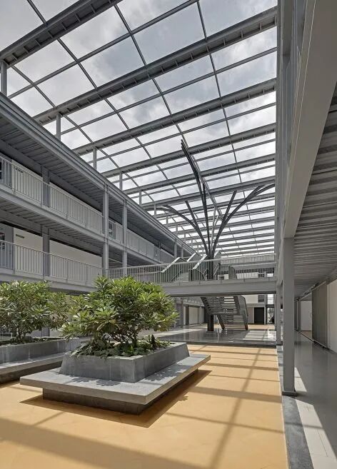 中庭一部分用作活动集会区,另一部分则是图书馆和视听室。中央的树状结构,我们称其为知识树,用来支撑中庭楼梯和过道。通高的空间将中庭楼梯与北边操场和南边自助餐厅相连接,便于学生在休息时间使用。