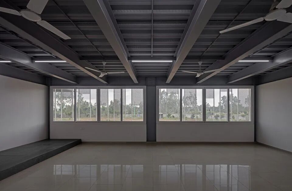 平面布局很简单,呈线性排布——在南北两边的教室可以欣赏到基地周边的自然景观,行政服务区则位于建筑的东西两侧。教室都在外部,走廊朝向中庭。中庭分为两部分,垂直交通流线在中间,包括楼梯和过道两部分。