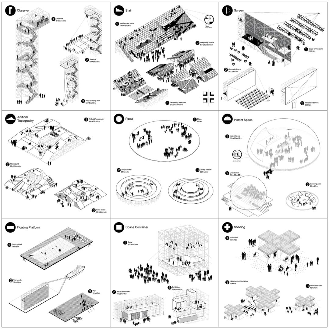 同时,还采用了9个具有不同活动设置、可以在不同地点和季节之间以不同组合相互切换、在水位上升时具备拆卸能力的临时脚手架凉亭。