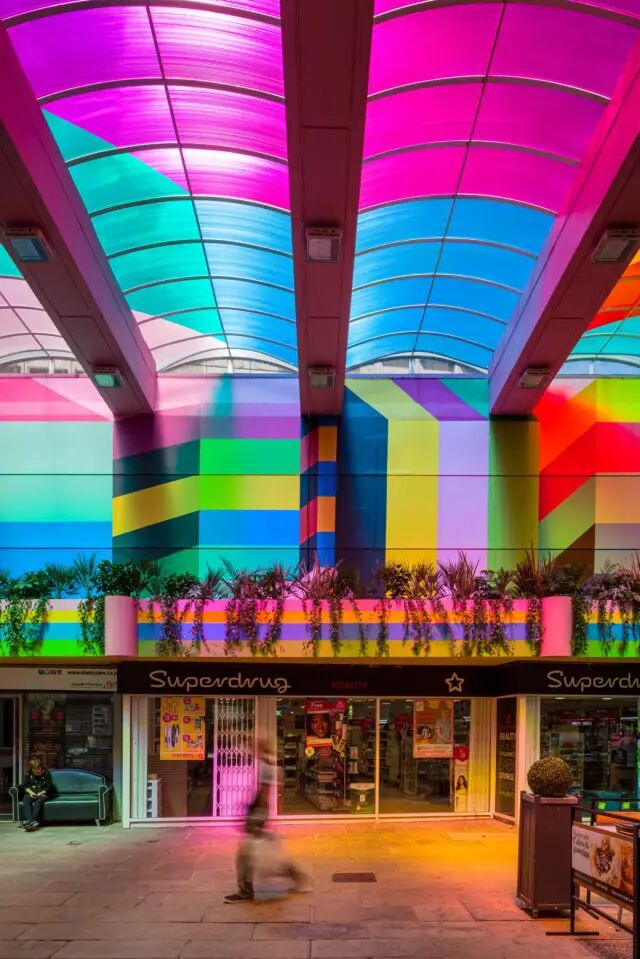 去年,Morag就在考文垂的赫特福德(Hertford)大街放置了一个新的装置,这个名为《连接我们的无尽丝带》(Endless Ribbon Connecting Us)的作品以连续的丝带形式环绕建筑内部,给整条街都铺上了一层糖果色的彩虹。