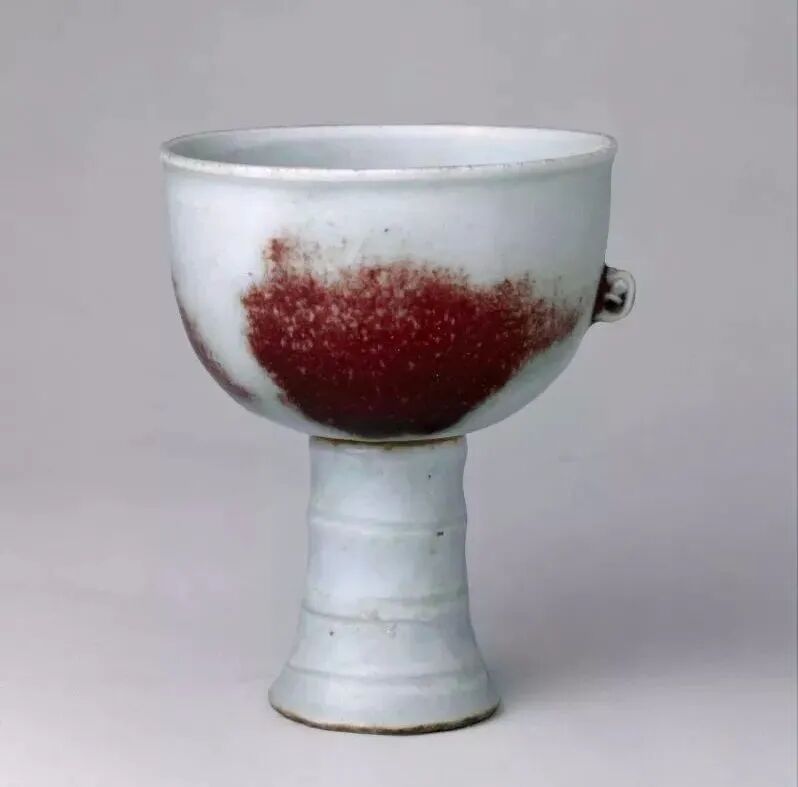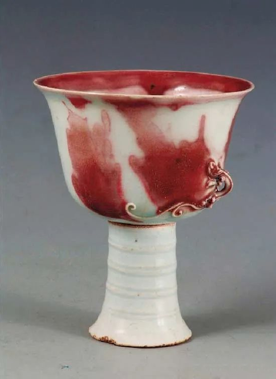 ▲元代 釉里红彩斑贴塑蟠螭龙纹高足转杯