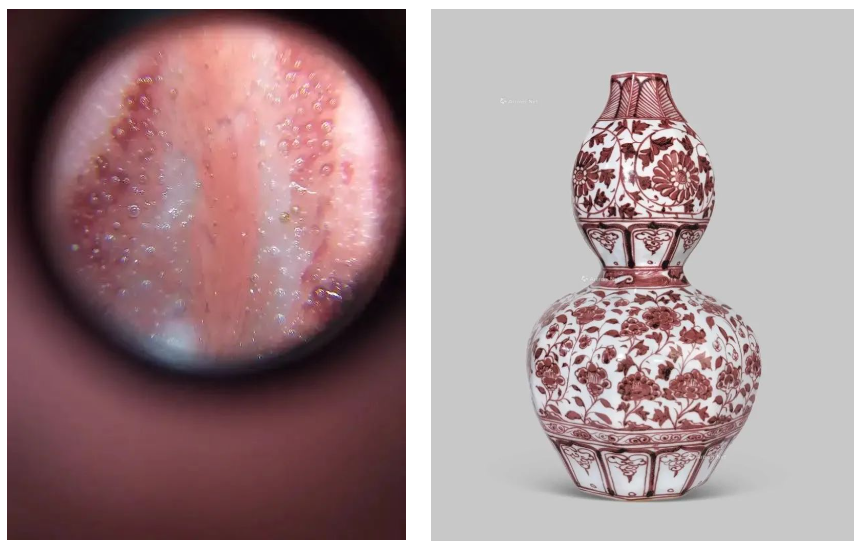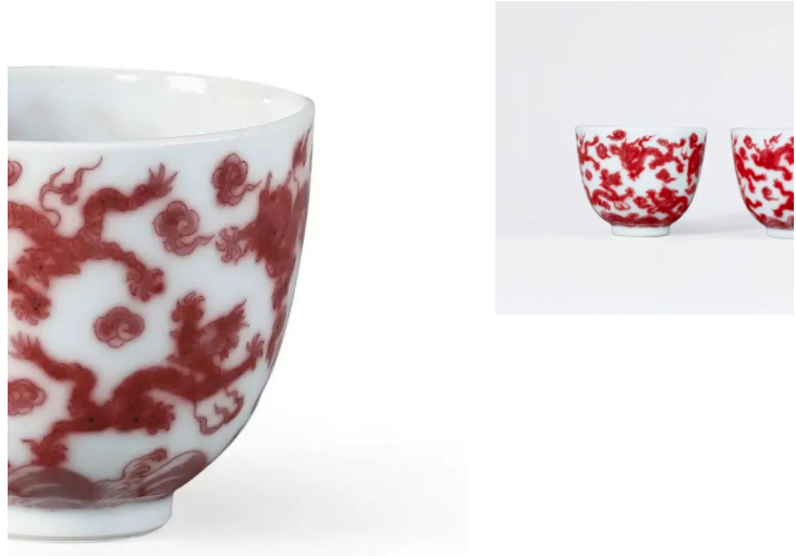 宣德釉里红传世极少,其胎体细腻,釉面洁白,再和明艳的釉里红相配合,达到了釉里红工艺极高的境界。