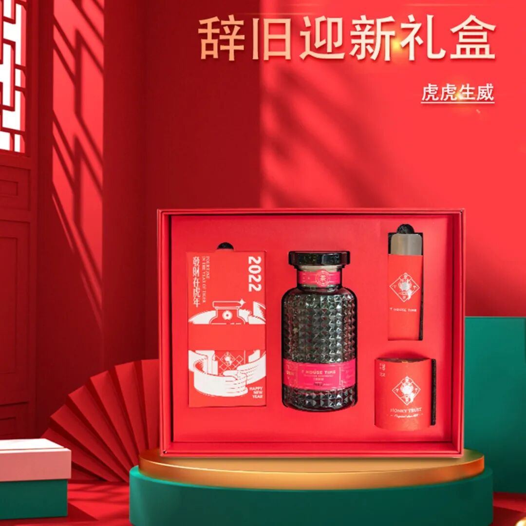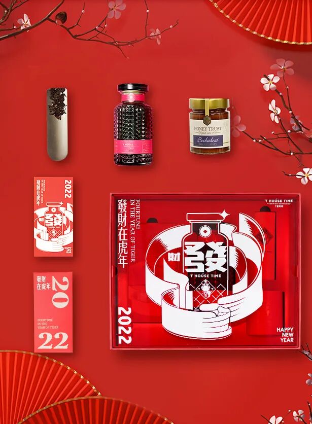 发财在虎年,预示虎年财运亨通,守住财运,红红火火。T HOUSE TIME闻花听鸟礼盒中含有三种口味的花果茶、歌帝梵巧克力和专心设计的红包。