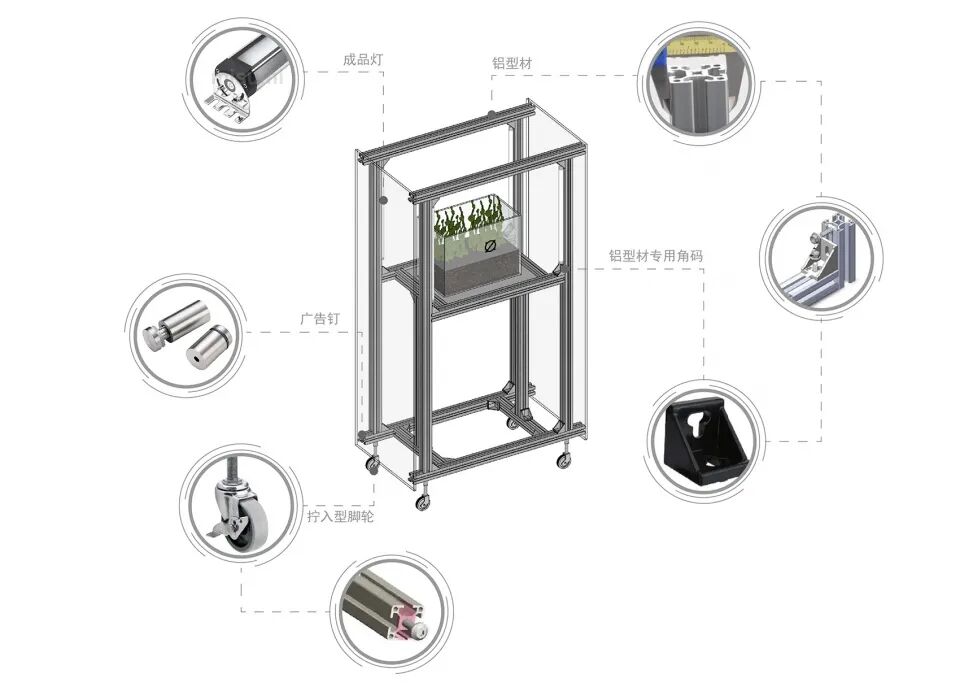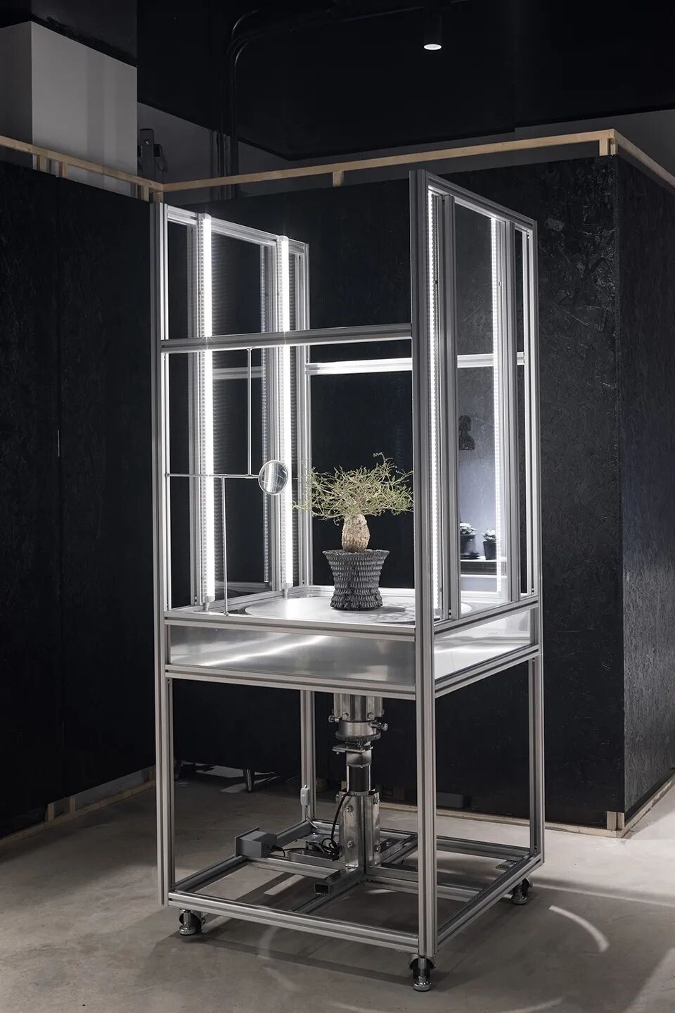 核心展陈装置特意选取了再利用的电动餐桌配件与铝架组合,重新组装成一个低成本的电动装置,既实现了块根植物受光的稳定,也给消费者提供了新鲜的观看模式。配套的小道具通过加设滑轮及天花悬挂电线,实现了移动的便捷性和用电的安全性。