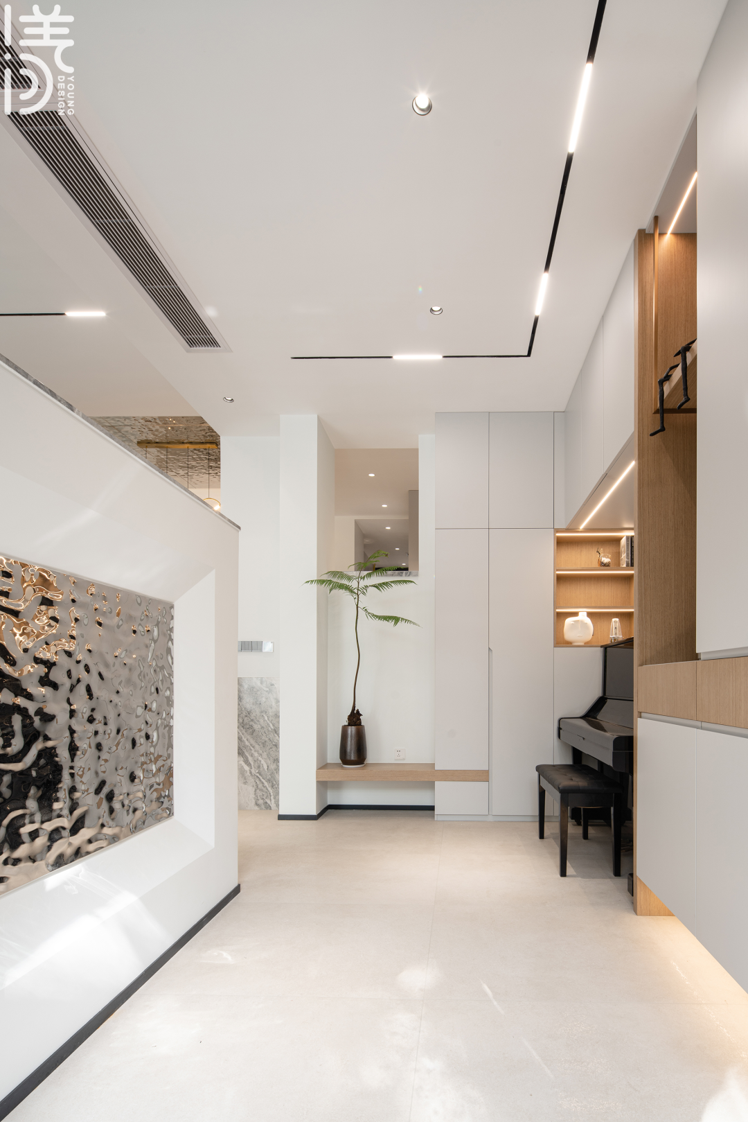 钢琴的一角,是业主的气质涵养,音符围绕的生活,是高山流水也是婉转悠扬。侧边木格栅的细节设计,与客厅的沙发墙相呼应,有特色却不孤立,恰到好处。宽敞的过道,也有足够的空间让狗狗尽情玩耍,且收纳空间充足,宠物用品也不用愁置放处。