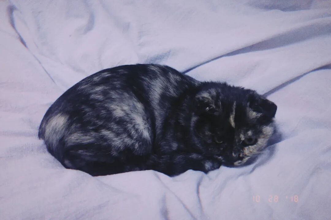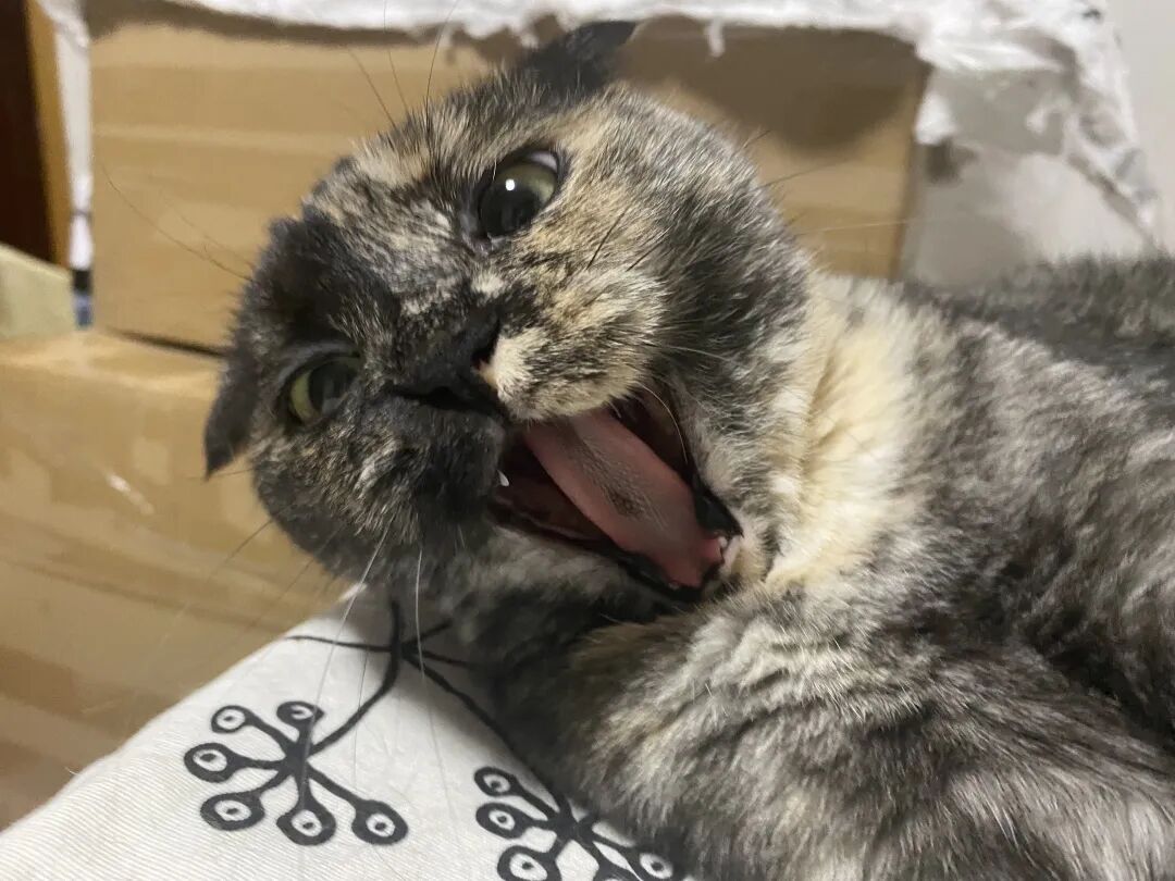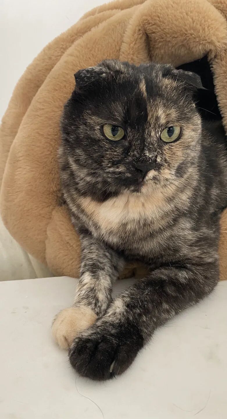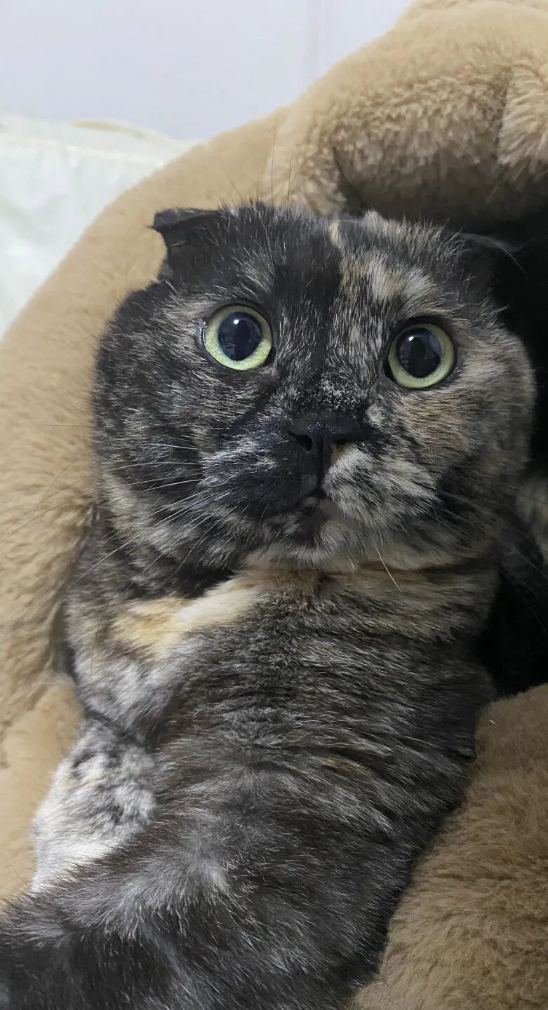 当全家人以为她已经丢了的时候她自己回来了,过了一段时间才发现怀孕了,好家伙出去不知道和哪个野猫浪完了就回来了。一共生下两只,都是玳瑁,都是阴阳脸。