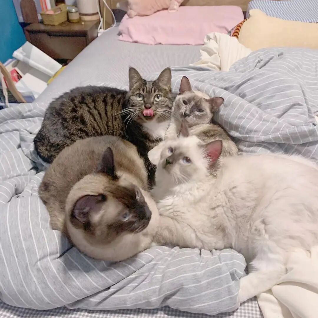 第一只猫是下雨天我在回家的路上捡到的,捡回来时还是未开眼的状态。第二只猫咪是和朋友在她家小区楼道捡到的,询问了很多人都没人认领我就把它留下来养了,第三只猫是朋友家里不同意养,我接手了,从此变成“三胎家庭”。