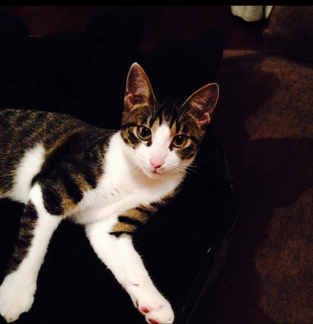 我的猫咪叫“屁股”或者“屁屁”,它是一只狸花猫。一开始它是只流浪猫,是朋友在他公司附近的垃圾桶捡到并把它养在公司里,当时正值八月十五,他给它起名“十五”,但是后来没有时间照顾,于是我就领养了。我把它带回工作室后给它喂了好多罐头和小鱼干,有一天蹲在它后面准备开罐头,突然闻到一股臭屁的味道,于是给它改名“屁股”。