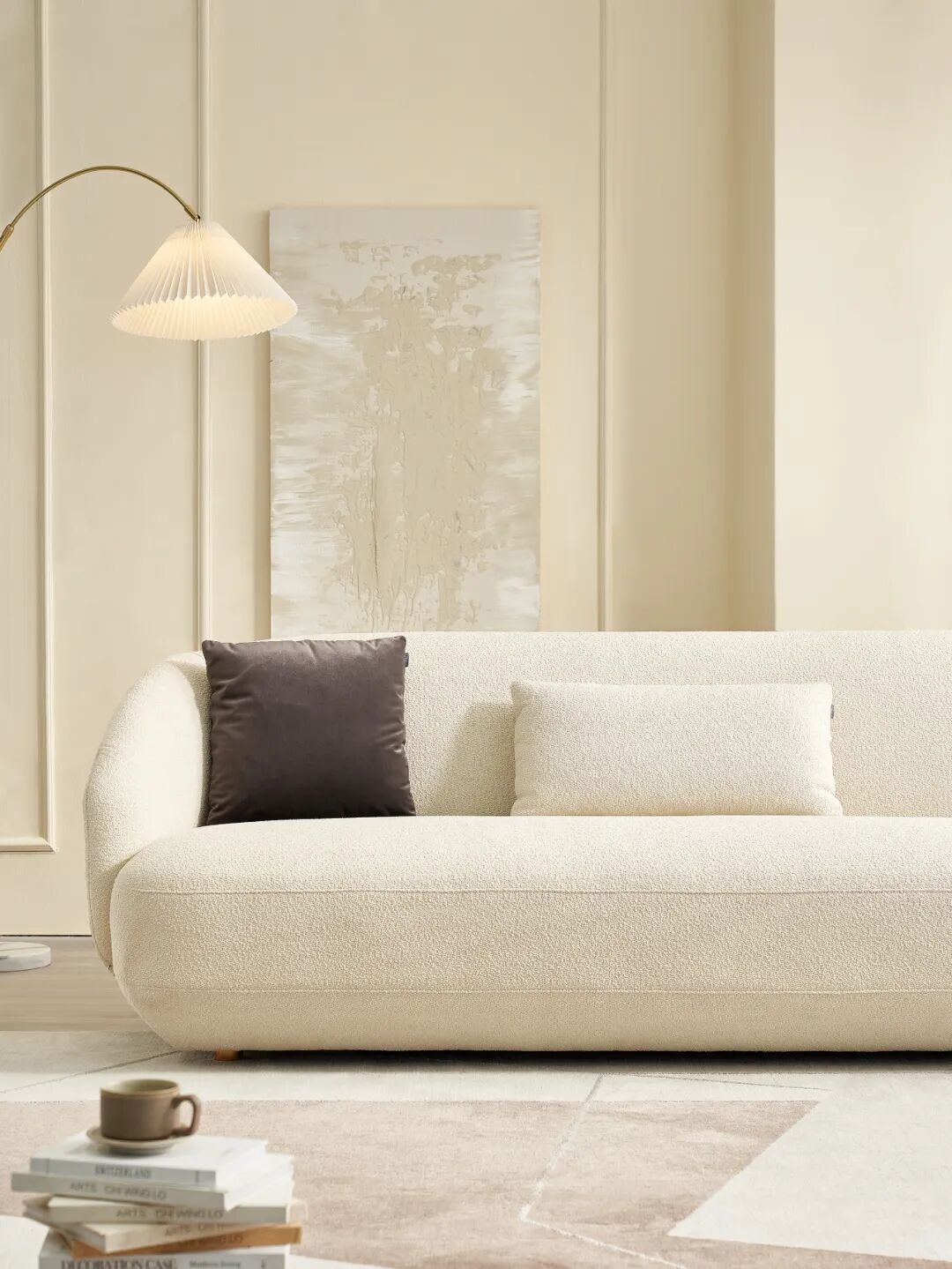 长沙发的整体造型采用一字型,边角采用落地斜切,沙发脚隐藏于主体之间,营造出一种轻微的悬浮感。