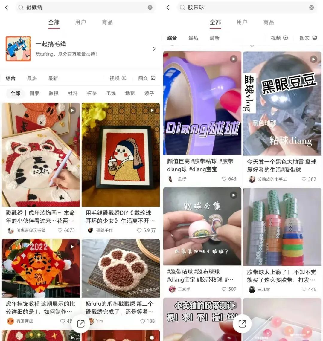 前者是把毛线扎进不同图案里,做成地毯、杯垫、挂饰等;后者是把不同颜色的软胶带从边缘撕开,慢慢粘成一个球,最后将成品球用刀片切开,观察里面的缤纷颜色。