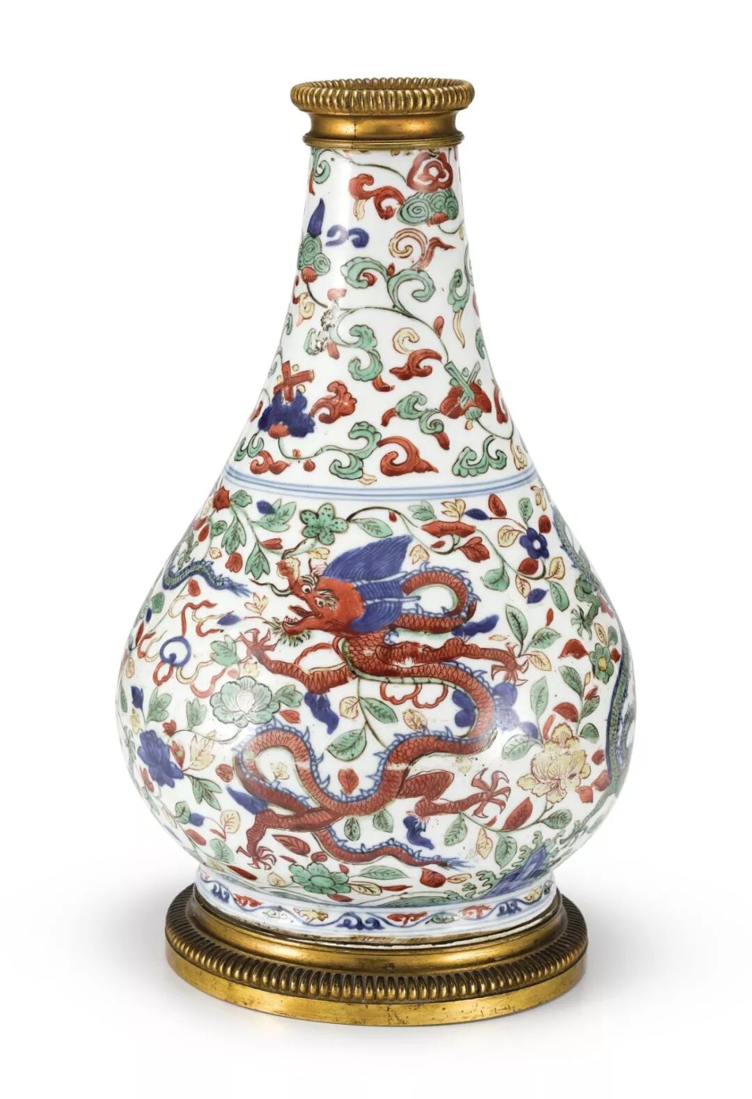 明万历 五彩穿花龙纹瓶(嵌鎏金口、足)