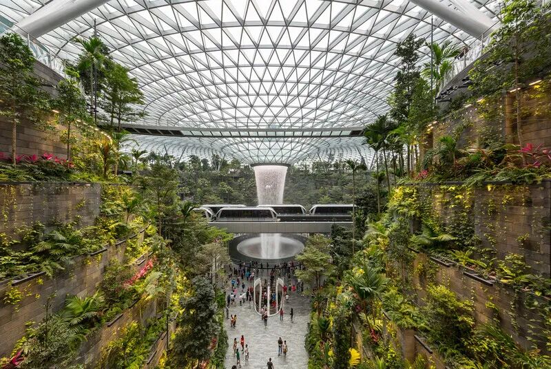 为巩固其国际航空枢纽地位,新加坡樟宜机场在1、2号航站楼之间建造了星耀樟宜——一座兼具零售、餐饮、休闲以及酒店等综合商业发展的巨型玻璃穹顶花园。一座全球最高的室内瀑布,从40米高20米直径的穹顶眼处直落至地下二层。