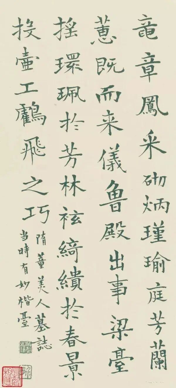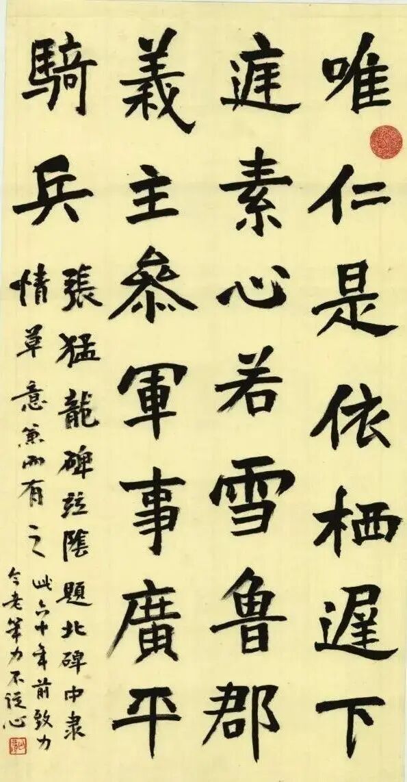 其隶书,以《礼器碑》为宗,用功最勤。1982年游寿在临汉《礼器碑》上题道:“余学隶是以发笔,以规矩,有劲也。”观其所书汉碑多瘦劲挺拔,但仍是高古厚重,可谓纤而能厚。其楷书,从到中大读书开始,由颜转而学习诸北碑、魏隋墓志,尤其吸收《张猛龙》碑阴题名神韵,隶情草意,而又具金石之气。