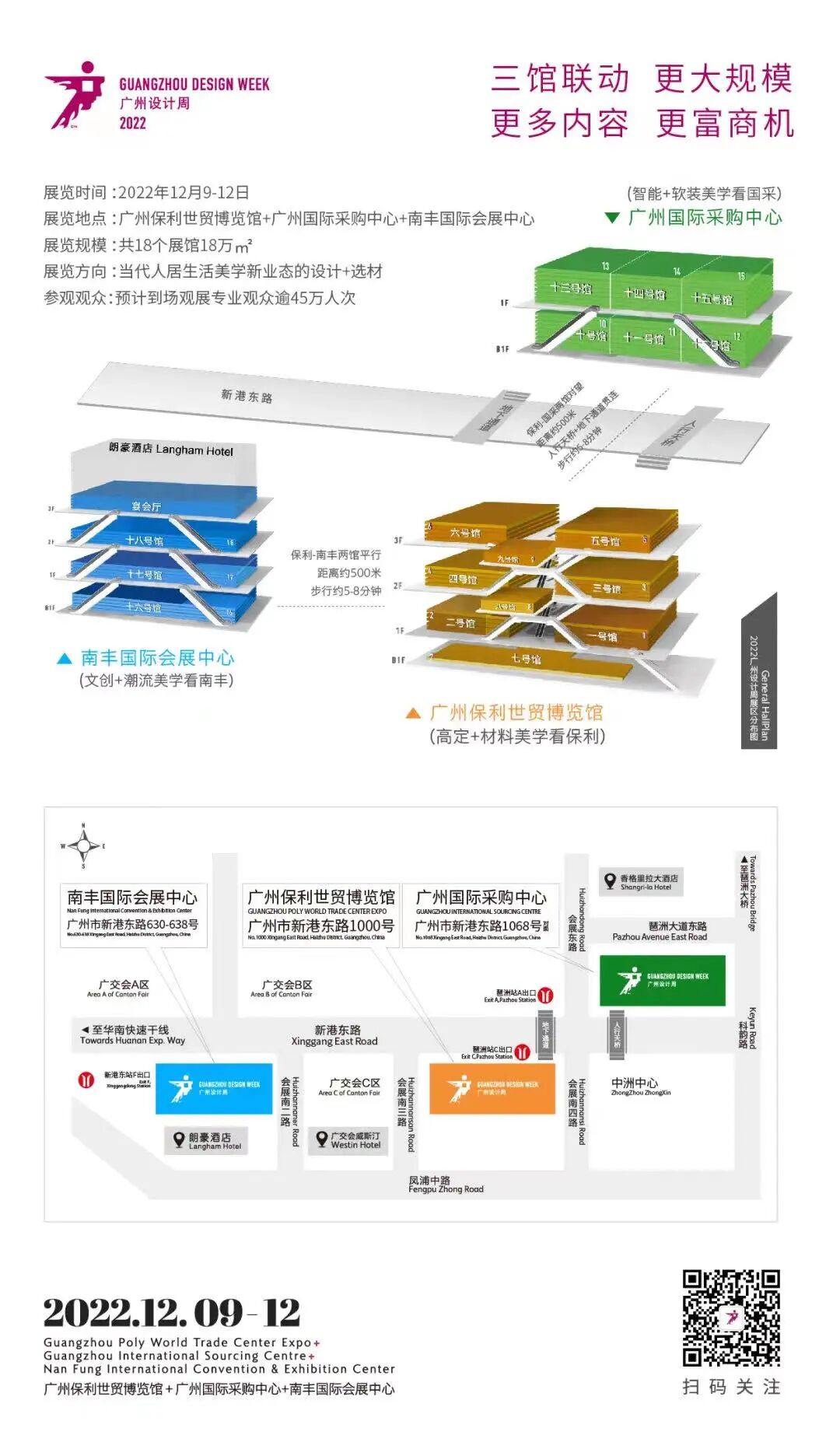 2022广州设计周同样规模不减,将以18万㎡展览面积的庞大体量呈现,更多品牌、更多活动以及更多元的超级策展将会在三座展馆中诞生!