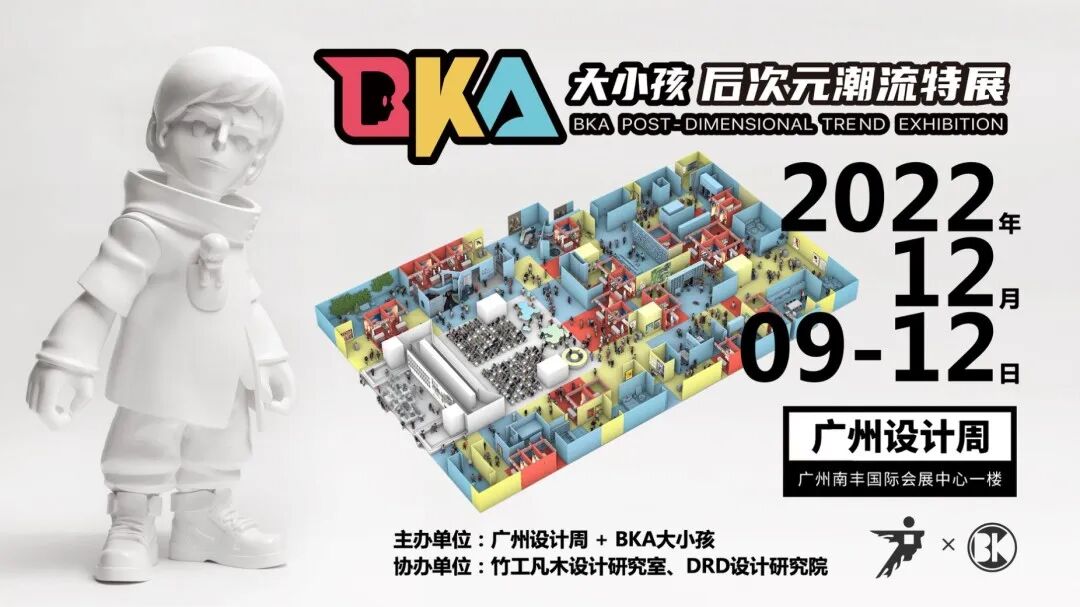 BKA大小孩后次元潮流特展,由广州设计周与BKA大小孩后次元潮流联盟主办,竹工凡木设计研究室创始人邵唯晏为总策展人。今年展览将继续秉承「设计+二次元文化」新消费趋势的主旨,采用“策展型零售”展中展的形式,在年底呈现出一场汇聚全国乃至全球最具影响力、走在潮流最尖端、最有价值的动漫潮玩品牌、潮流艺术家、设计师等共同组成的超级特展,进一步推动艺术、潮玩产业振兴发展!