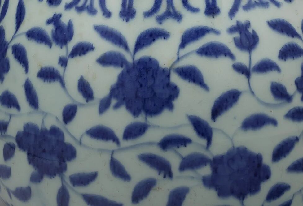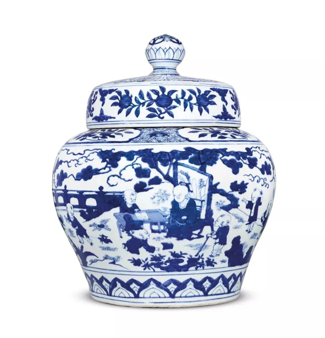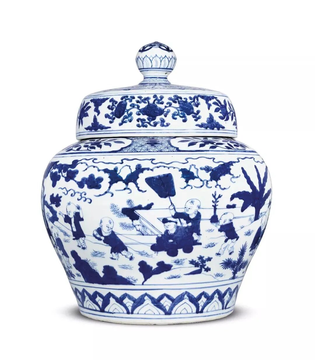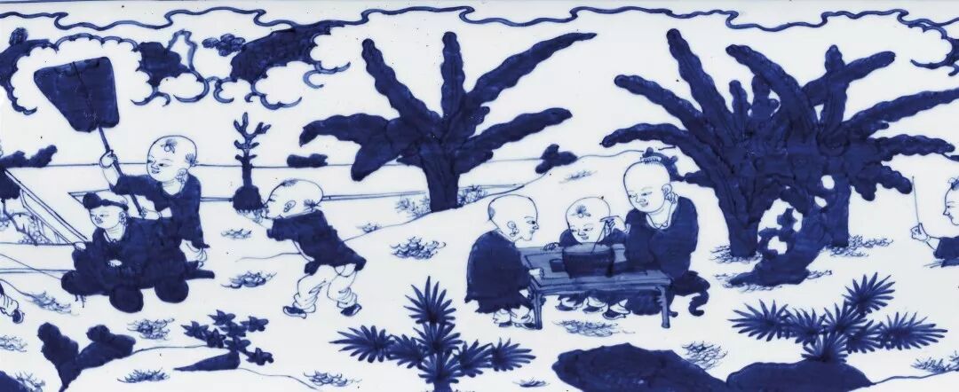 以这类题材为装饰的瓷罐又名“百子图罐”,多用极品青料绘就,画工拙朴生动。通景纹饰正是以此为题,其钴蓝苍翠浓艳,乃嘉靖御瓷常用的青料。