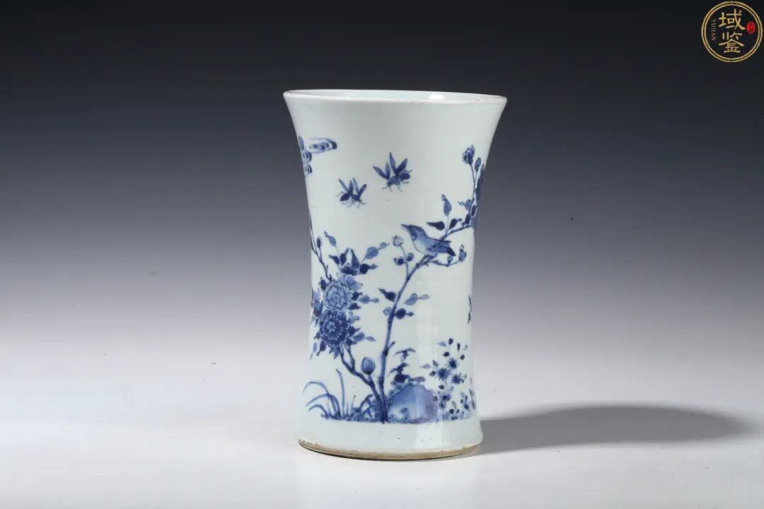 近期,域鉴APP的严选优品中上新一明崇祯·青花花鸟纹束腰笔筒,愿请诸君共赏之。
