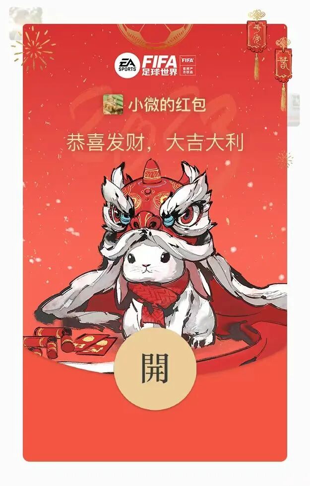 当然,选用兔年兔子元素的封面也非常常见。比如B站、波克城市《爆炒江湖》和《猫咪公寓2》、腾讯《FIFA足球世界》等厂商或产品。另外,近年传统文化在游戏产品中的盛行,也与红包封面的年味儿相当契合。像是三七互娱《叫我大掌柜》、艾洛央青《画唐》等产品本身就与传统文化相关,也能通过封面来加深这种印象。