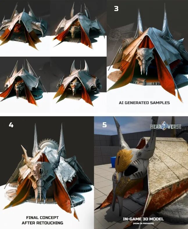游戏中的部分3D建筑概念图也是由AI生成的,团队向Midjourney输入帐篷的三视图,由系统生成一张主概念图,再进行人工监修,最终成为3D建模的参考概念图。负责人表示,在AI的帮助下创作一张场景概念的时间从1-2周压缩至1天以内。