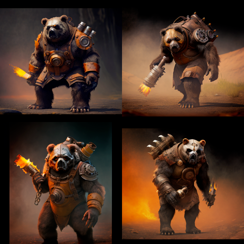 例如输入“一只行军之中的邪恶灰熊,穿着铁制的盔甲和头骨装饰,动态的攻击姿势,古老的头盔和防毒面具,后启示录风格”: