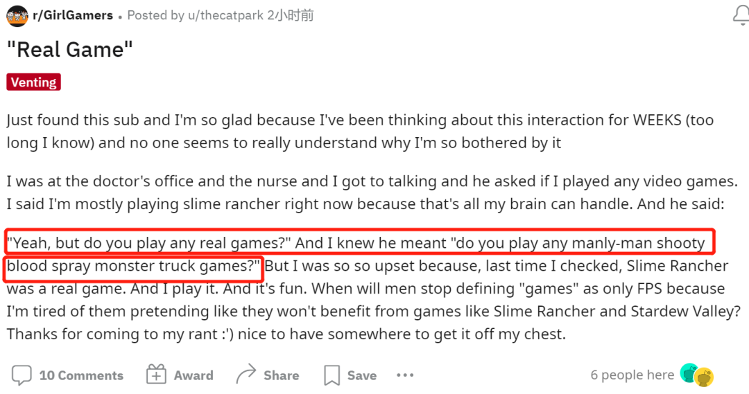 一位叫Briar的妈妈说:“所谓‘男性游戏’就是比较重度硬核的游戏,而‘女性游戏’就是休闲轻量的游戏。这并不是因为我们玩不来这些硬核游戏,它们只不过不是我们的首选,我们没有时间也没有精力。”