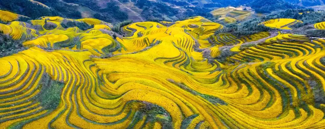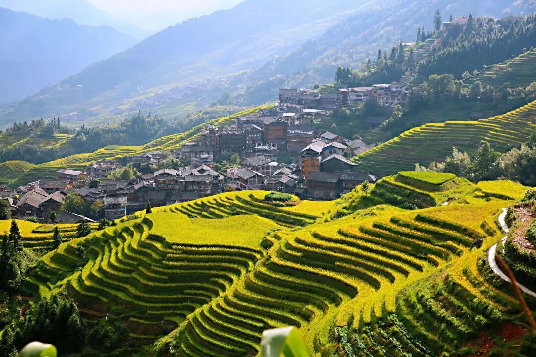 广西的龙脊梯田便如轻策庄一般的存在。桂林龙胜县东南部和平乡境内的龙脊山,有一个规模宏大的梯田群,如链似带,从山脚盘绕到山顶,小山如螺,大山似塔,层层叠叠,高低错落。从水流湍急的河谷到白云缭绕的山巅,从万木茂密的林边到石壁涂崖之前,凡是有泥土的地方都开辟了梯田,这些梯田垂直高度达五六公里,横向延伸也有五六里。其线条行云流水,潇洒柔畅;其规模磅礴壮观,气势恢弘,有“梯田世界之冠”的美誉。