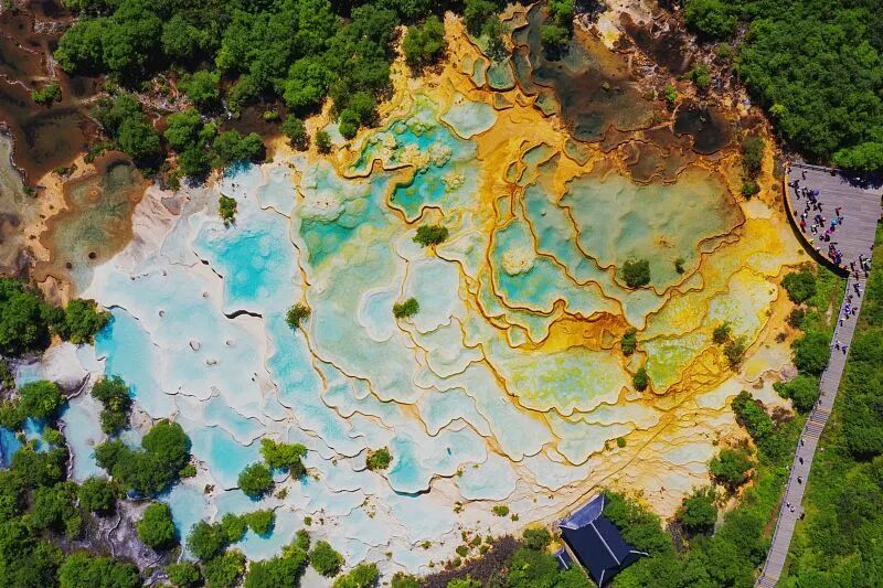 原神璃月的渌(lù)华池有一处隐蔽之地,传说因清澈的相思映满旧日的原谱造就了温润清澈的湖水,故其称为渌华池。现实中的渌华池位于四川省的黄龙五彩池。形状各异的五彩池就像许多水彩板。