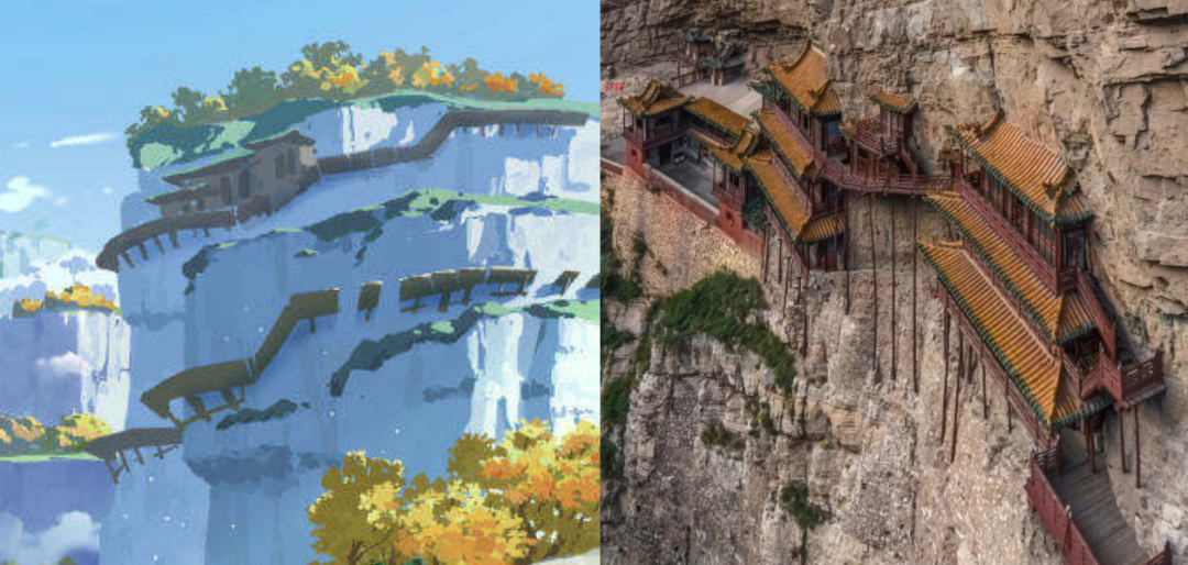 悬空寺位于大同翠屏峰峭壁间,整座寺庙紧贴崖壁建设,犹如悬挂在悬崖峭壁之上,极为壮观。从璃月港初期的创作稿可以清晰的看到凤凰古城临水而建,悬空寺贴崖而建的特点。