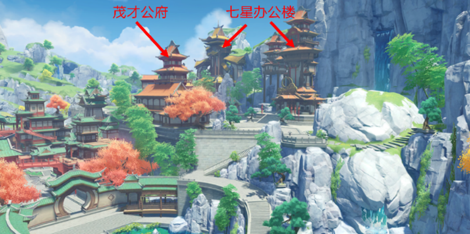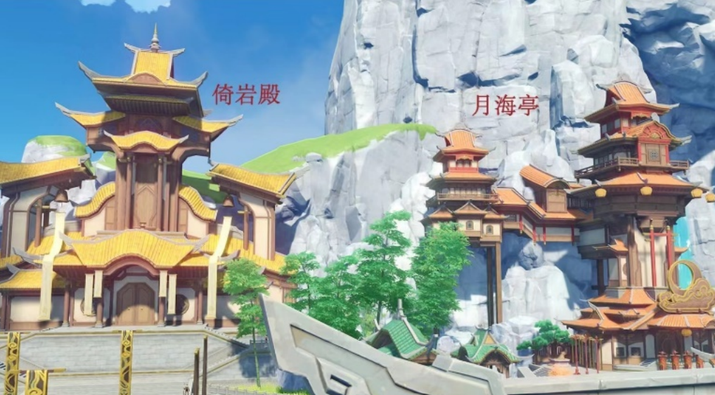 两座璃月七星的办公楼分别叫倚岩殿和月海亭。倚岩意为伴石而生,指代璃(矿石),月海指代月,两座建筑合为璃月。倚岩殿是黄色琉璃瓦。自唐高祖起,黄色只有皇帝才可以用。这一点也体现在建筑中,只有皇帝相关的建筑才可以使用黄色琉璃瓦。场景中作为举办请仙典仪的场所,倚岩殿使用黄色屋顶比较合理。