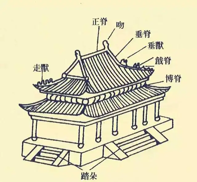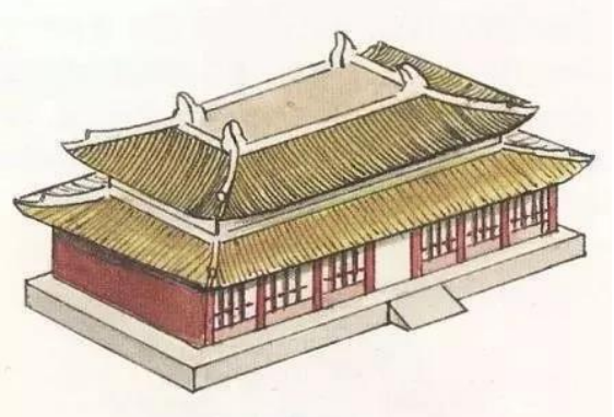 同样,仅皇帝可用的建筑形式(除太庙)还有庑(wǔ)殿顶,即庑殿式屋顶,是古代屋顶样式中等级最高的。由一条正脊和四条垂脊共五脊组成,又称五脊殿。由于屋顶有四面斜坡,又称四阿顶。
