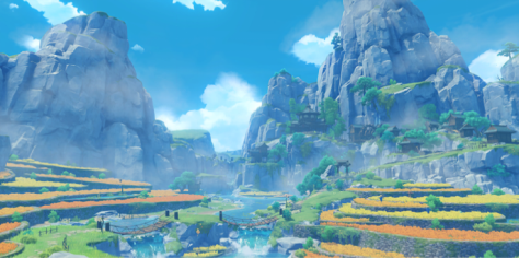 原神的轻策庄,白云缭绕的山谷间,点缀着鳞次栉比的半月形梯田,山风吹拂时,便可看见一层层多彩的波浪。