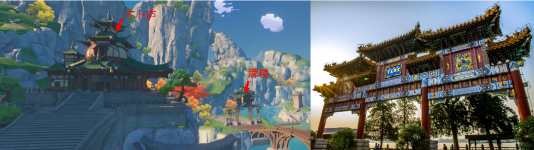 在进入璃月港时,会看到牌楼一样的入口,还有桥,很有仪式感。紧接着拾阶而上,会产生庄重感,后面到了不卜庐,造型像个葫芦,门前的水池和山石,有些像葫芦中流出的水。璃月港北大门是座牌楼,在古代城市里牌楼一般用作街坊门或者纪念性建筑。