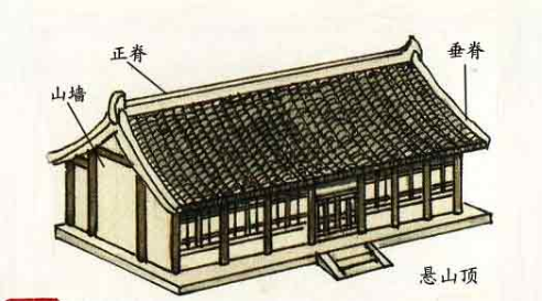 悬山顶是仅次于庑殿顶和歇山顶,是我国一般建筑(民居)中最常用的一种形式。悬山顶有五条脊,一条正脊和四条垂脊,前后两个坡面,屋顶两侧悬在山墙外,因此得名“悬山顶”。