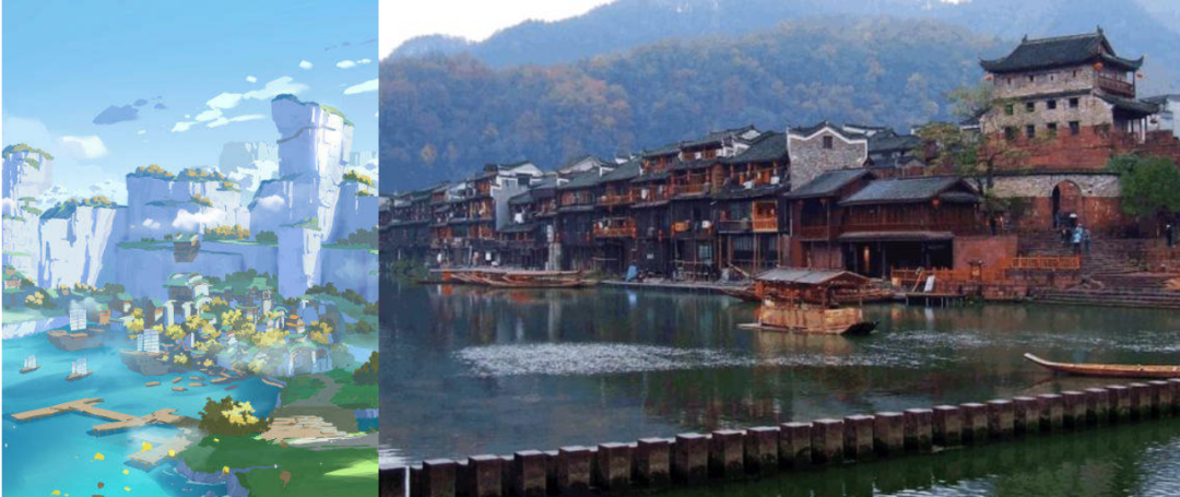 璃月港的设计灵感来自于凤凰古城和悬空寺。凤凰古城位于南华山下,紧邻沱江和小溪河建设,巧妙利用山水,形成了高密度、自然生长的建筑群落,沱江两侧密集的临河吊脚楼,使得这里的景色别具一格。