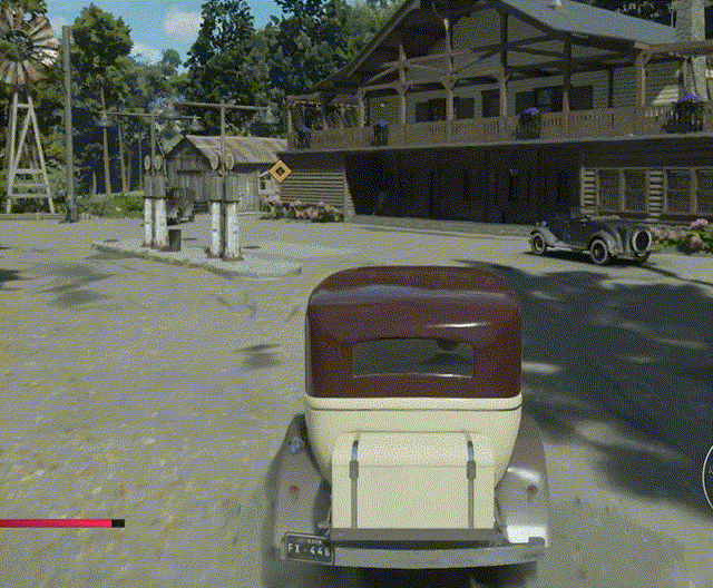 在玩家开始驾驶后,画面右下角会以仪表盘的形式呈现当前车速和小地图导航。为了契合整个游戏的年代感,两个组件外框都做了金属质感设计。小地图的外框上还做了指南针设计,随着玩家车辆方向的移动,外框指针也会随之转动。这既让玩家可以全方位的知晓当下前进的方向和路线,也契合真实驾驶场景中能够获取的信息形式和信息量。