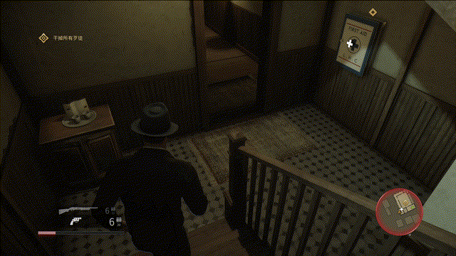 在完成这个任务之后,汤姆也正式加入了黑手党。紧接着汤姆被指派了第一项工作:玩家在NPC的指引下前往酒吧收取保护费,由于目标酒吧已经被敌对帮派控制,玩家需要武力消灭所有的人才能完成任务,此时玩家就顺势被引入了实战操作教学。实战中,只有玩家移动到对应的道具前时,画面中才会显示相应的操作,这样的设置符合玩家的即时操作需求,可以有效提升教学效果。