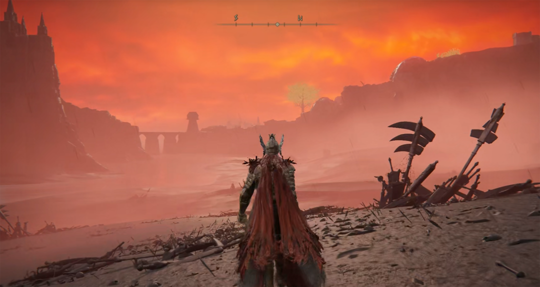 为了更好地使玩家沉浸于游戏画面,《艾尔登法环》采用了简洁的交互设计风格。在非战斗状态下,用户界面简化到只留有屏幕正上方指明方向的方位标尺,其它UI组件是全部隐藏的,这样的设计使玩家能够在赶路时沉浸式地欣赏交界之地的美景。只有在战斗状态下,人物的血蓝绿条,状态,装备等组件才会完整地显示出来。