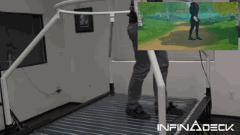 真正能解决VR移动问题的方法是一种名为“万向跑步机”的设备,它能让玩家在一块很小的平台上向各个方向自由移动,使玩家在游戏内真正使用自己的双脚来移动。