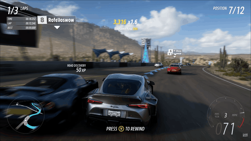 在驾驶过程中通过完成如破坏地图、长时间无碰撞、漂移、保持高速、与其他车辆擦肩而过等一系列操作,能够获取经验,且连续完成的操作时间越久、次数越多,获取的经验值倍率更高。这些操作的达成条件门槛非常低,几乎在驾驶的任何时刻玩家都能够得到系统的夸奖。色彩鲜艳且不断跳动的数字与闪动的奖励提示能够给予玩家很强的正反馈,即使冲出赛道撞坏沿途的围栏,也能够获得奖励。