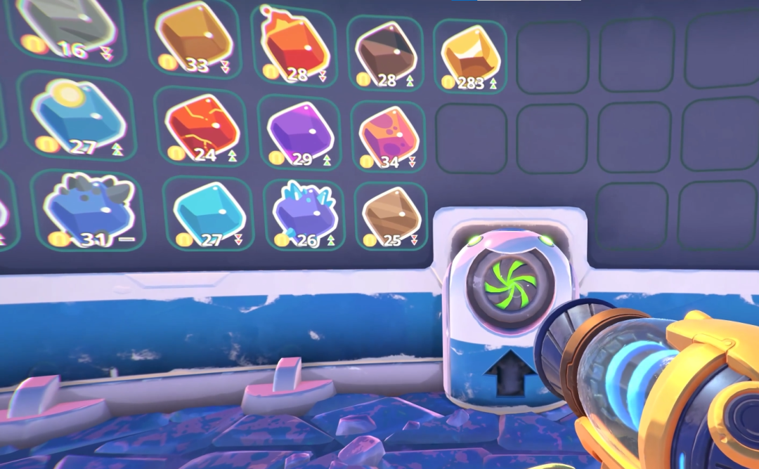 出售结晶的方式也依赖于真空枪。玩家首先需要把史莱姆结晶吸入背包中,再到结晶市场前对准收集口吐出结晶。不同于传统的设计通过平面的图文和按钮进行操作,《史莱姆牧场2》对相关UI进行了场景化包装,把信息显示在场景的屏幕上,通过真空枪进行操作上的交互,更能带来操作的真实感与代入感,让玩家切身体验到交易时一手交钱一手交货的现实操作。